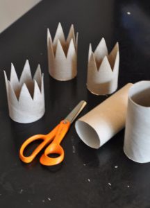 2- Knip punten in de toiletrol zodat het een kroontje wordt. Kijk maar op de foto hoe het er uit kan zien. Je mag zelf weten hoeveel punten je kroon moet hebben. Knip niet te ver naar onderen, want er moet nog een touwtje of lintje door heen.