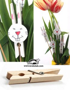 Of deze Paashaas knutsel. Verf een houten knijper in je favoriete kleur. Elke kleur mag! Knip uit papier een cirkel waar je een hazensnoet op tekent. Plak die op de zijkant van de knijper. Kijk op de foto hoe het moet. Nu nog een beetje kleur op de oren en je Paashaasje is klaar.
