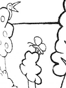 Dit is een tekening van een klein stukje van de muurschildering op de muur van de fietsenstalling op Jeugdland. Vrijwilliger Christiaan heeft hem voor jullie gemaakt.